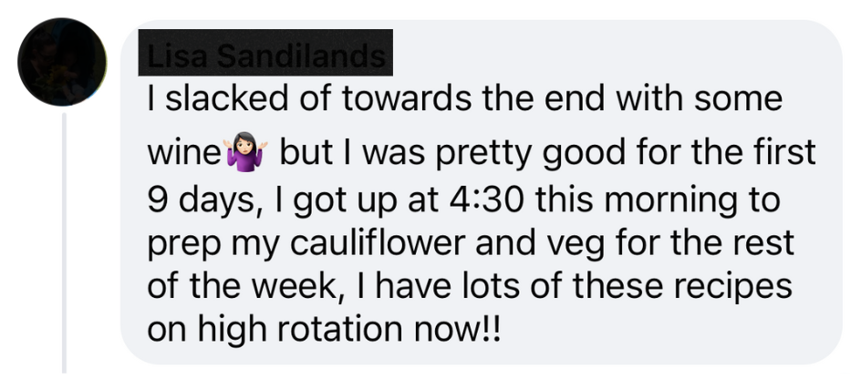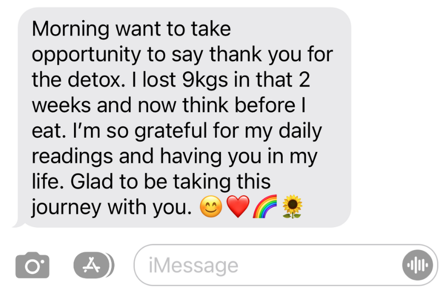 "I wanted to say thank you so much for your 14 day cleanse. At first I was feeling a little skeptical and didn't think I could do it. I had no idea that the food I was eating was affecting my mood and my energy levels. I now feel amazing! I have learnt so much and have discovered many amazing recipes. Thank you so much. It has literally changed my life!"