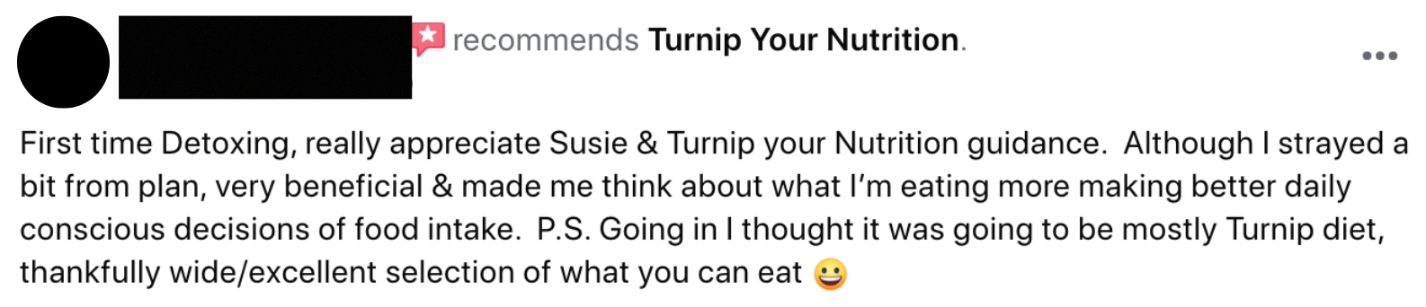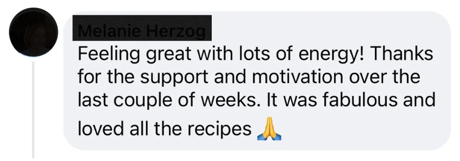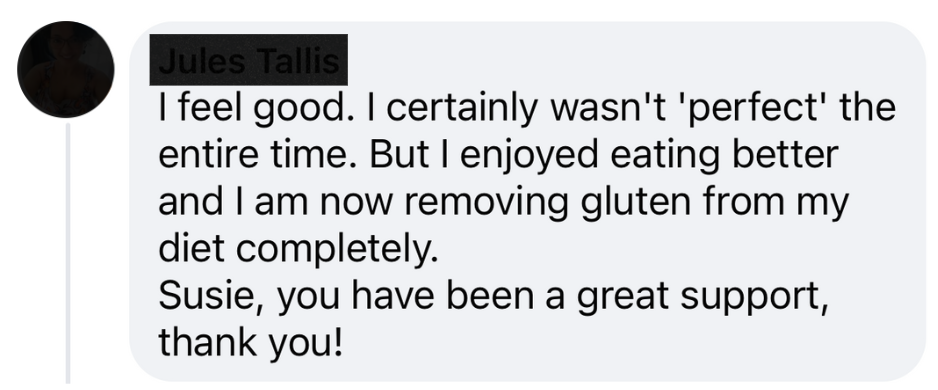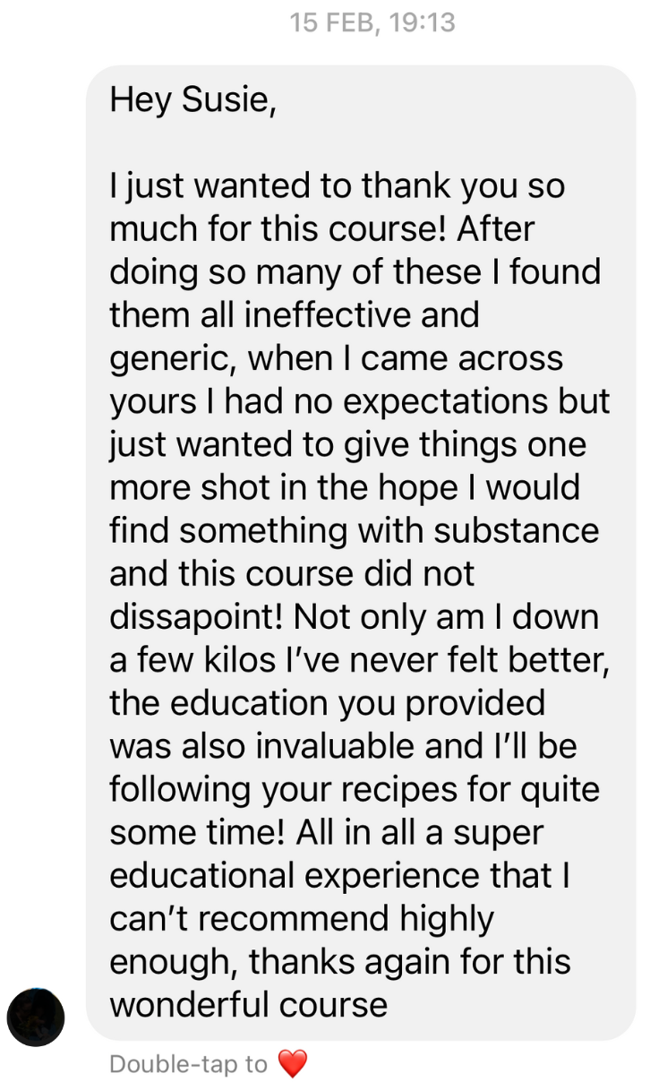 "After doing Susie’s 14 day cleanse I feel incredible. I no longer crave sweets or processed foods and I am happy to eat to nourish my body. I feel energised, no more brain fog, I’m sleeping well and have dropped a few kilos. I am so grateful for all that I have learnt and been able to implement for myself and my family. Thank you so much Susie. Forever grateful."