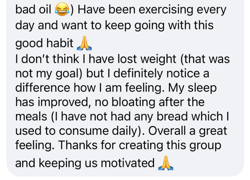 "OMG! I thought I was healthy before, but this has been an eye opener. I feel fantastic! My digestive health has improved and my bowels are now functioning as they should be. I have more energy and my skin is glowing. I am feeling refreshed, revitalised and energised. Highly recommend this program."